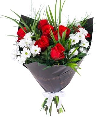 Kırmızı güller, okakiptus ve kurutulmuş lavanta kullanılarak hazırlanmıştır...