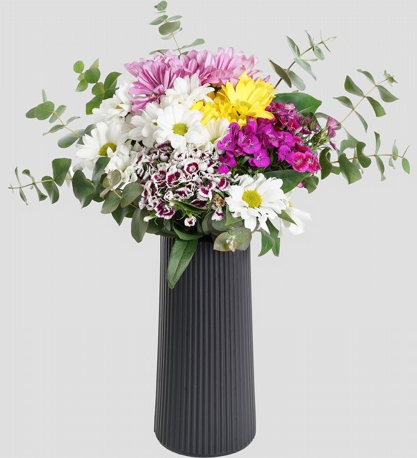 Siyah Çizgili Polimer Vazoda Karışık Çiçekler